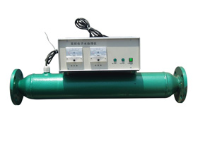 电子式水处理器是利用电子元器件产生的高频交变电磁场,让水在经过水处理器时,物理性能发生改变。由原来易吸咐在容器表面的斜方晶系晶体,变成不易吸附的三斜晶系的针装晶体,从而在管壁上无法结垢,达到防垢的目的。由于水分子在磁场、电场的作用下减弱了垢盐离子的结合,使垢盐离子形成开垢表面,成为水合离子进入水中,使受热炉壁、管壁上原来的水垢逐渐软化、疏松、自行脱落,起到除垢的作用。水中的细菌、藻类细胞因高频电磁场、电场的作用,使细胞内原生质产生电离,影响细胞的正常代谢,导致菌藻死亡,起到杀菌、灭藻的作用。